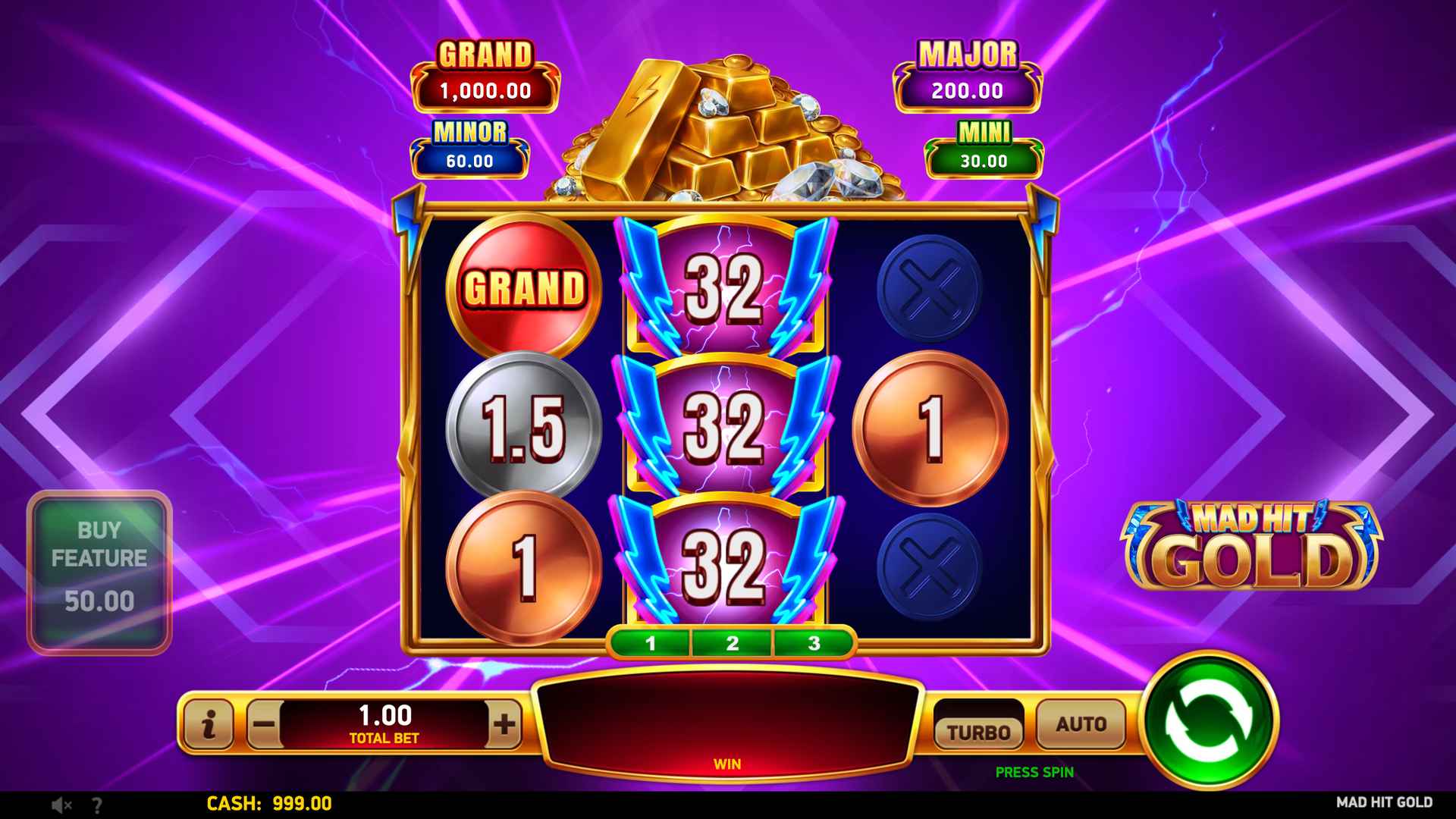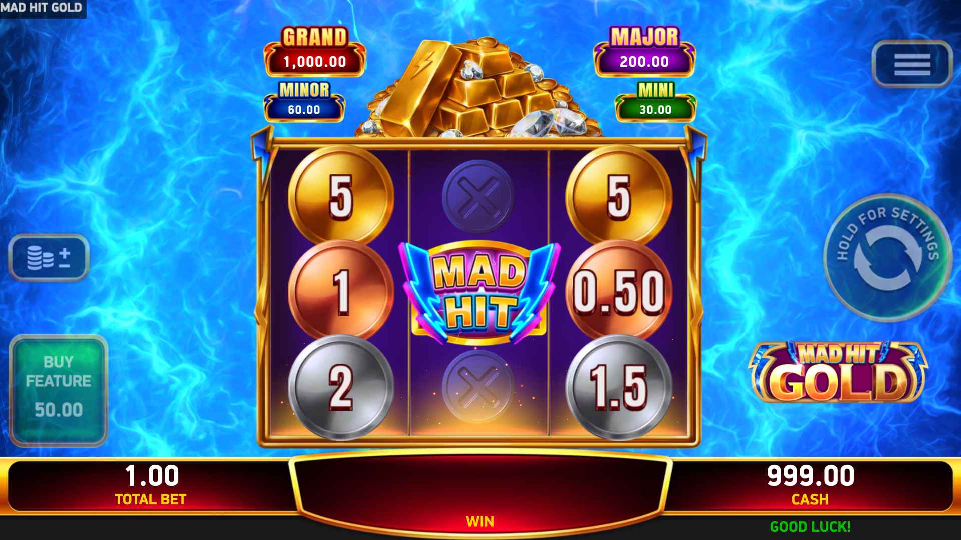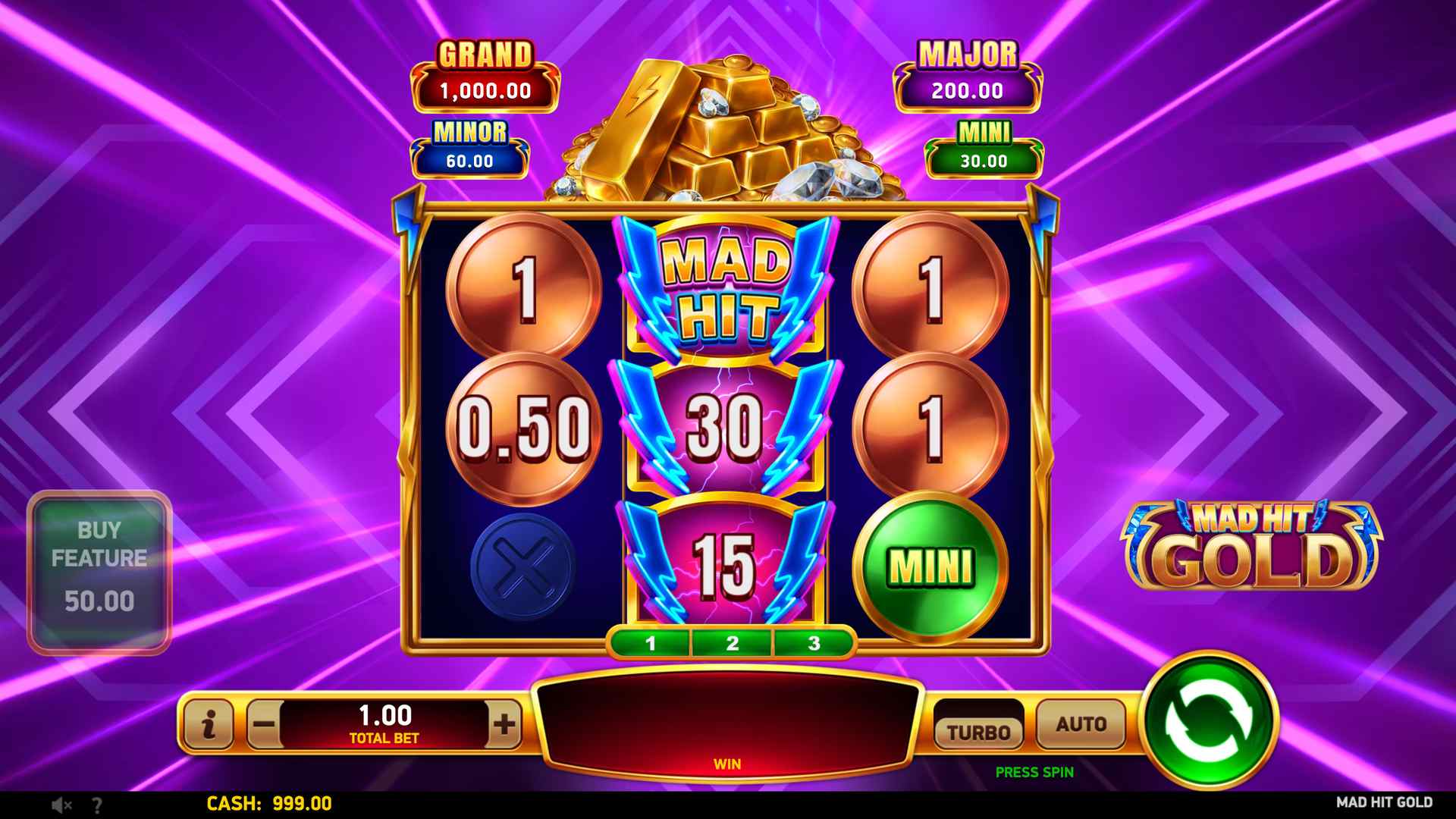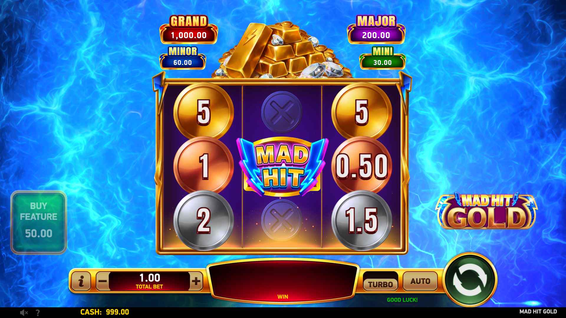 Step into the electrifying world of Mad Hit® Gold, a 3-reel, 3-row slot where every spin pulses with high-voltage excitement amid piles of shimmering bullion. There are no paylines, just pure winning potential.