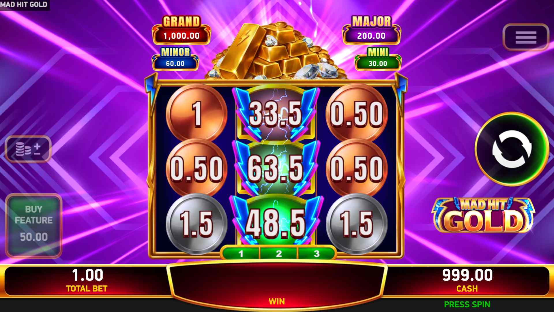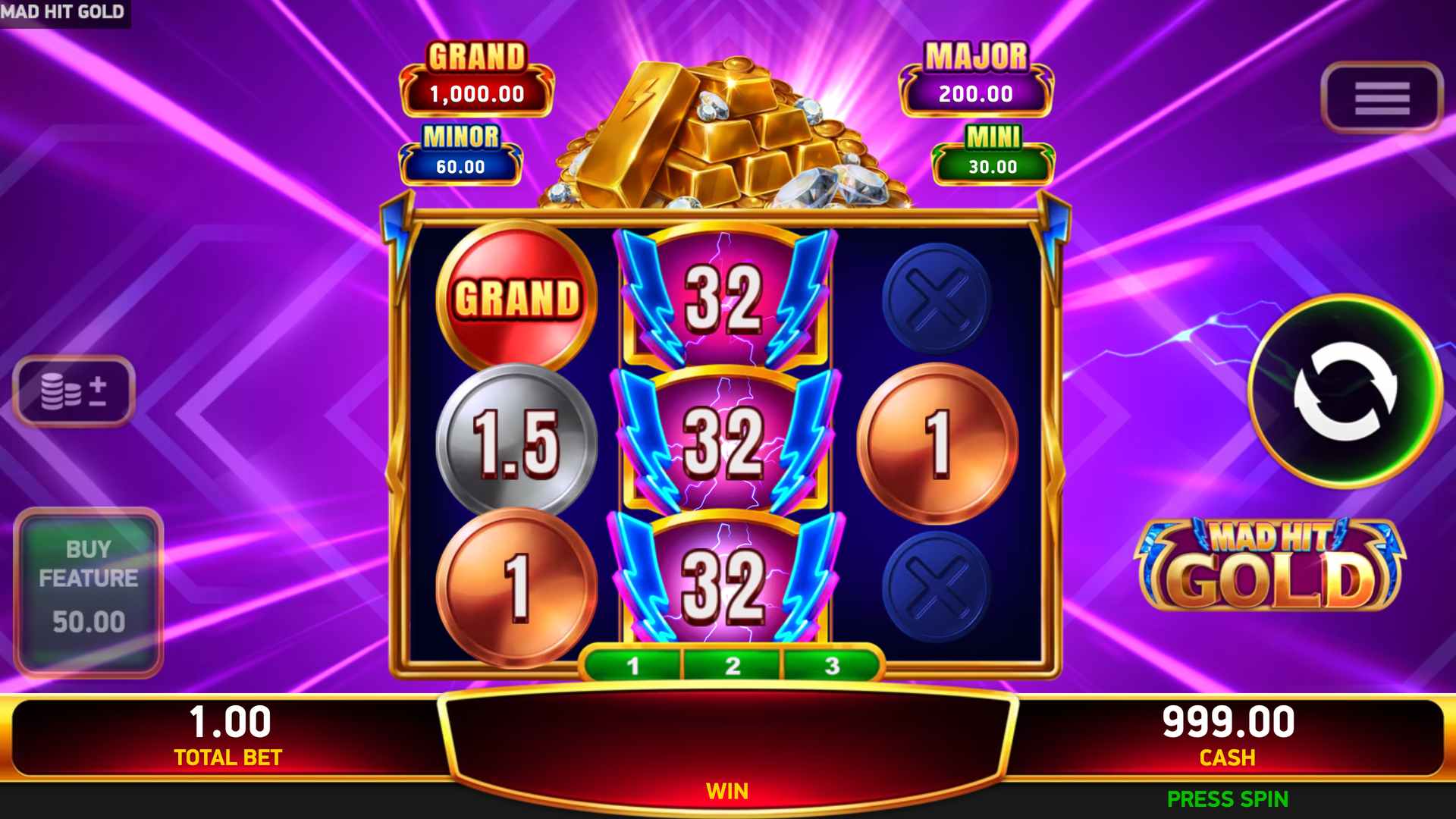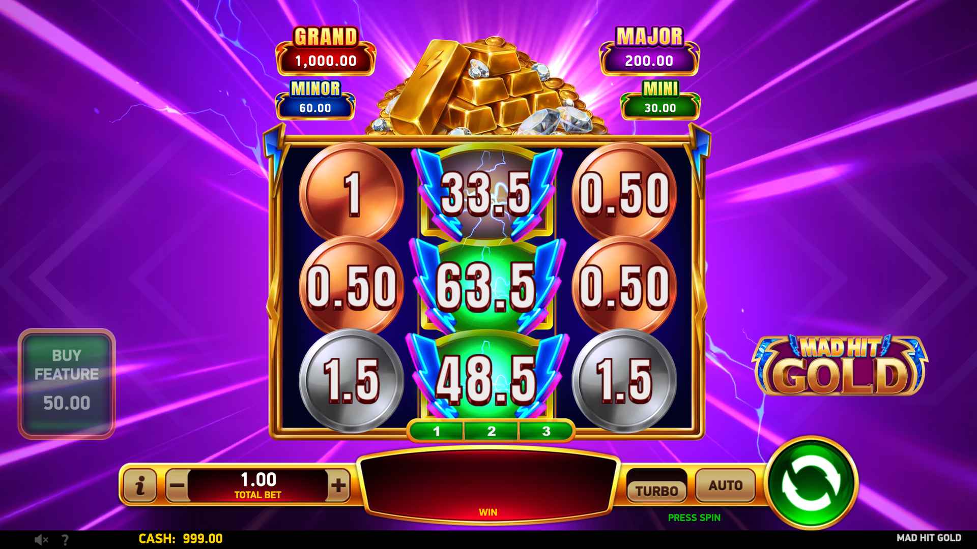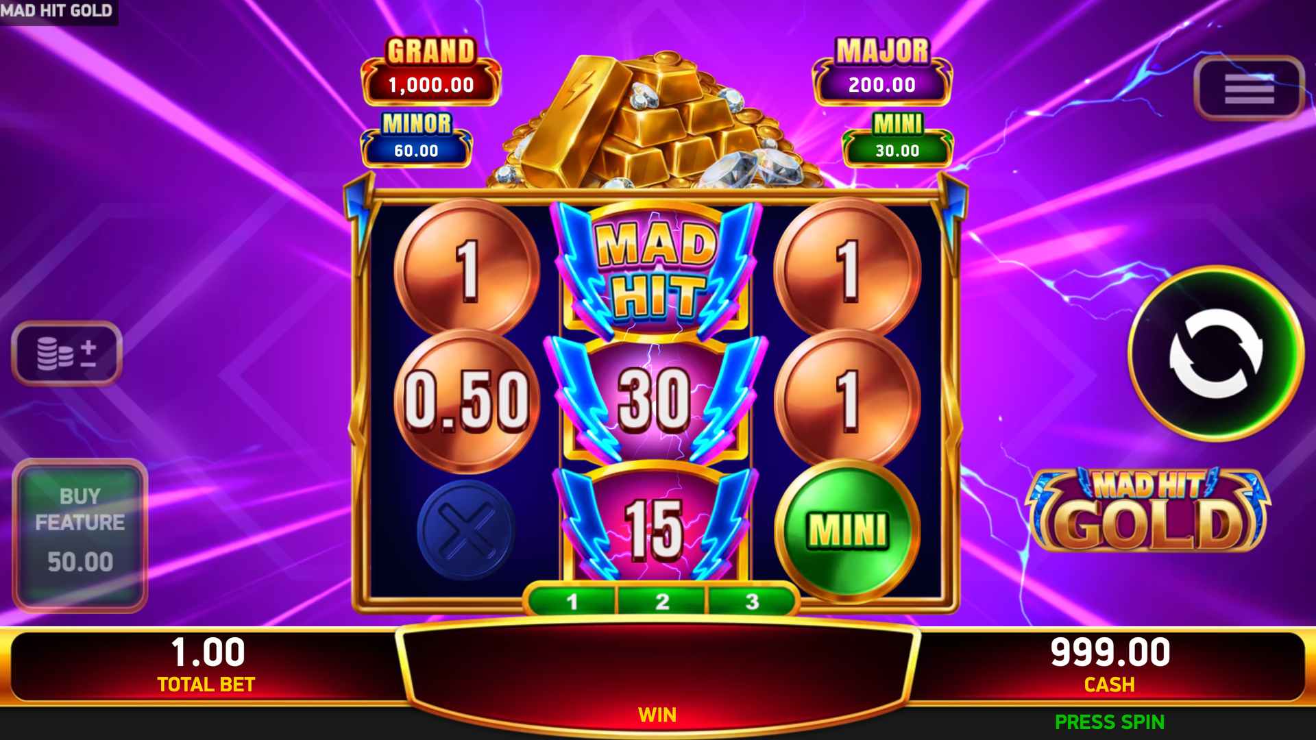 Step into the electrifying world of Mad Hit® Gold, a 3-reel, 3-row slot where every spin pulses with high-voltage excitement amid piles of shimmering bullion. There are no paylines, just pure winning potential.