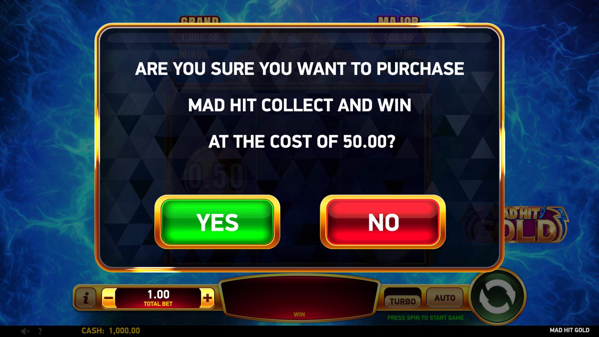 The Mad Hit® Instant Win feature delivers quick rewards when the Mad Hit® symbol lands on reel 2 alongside Coins on reel 1 or 3. Each Coin can pay up to 100x your bet, plus chances to hit the Mini, Minor, Major, or Grand Jackpots towering over the reels.